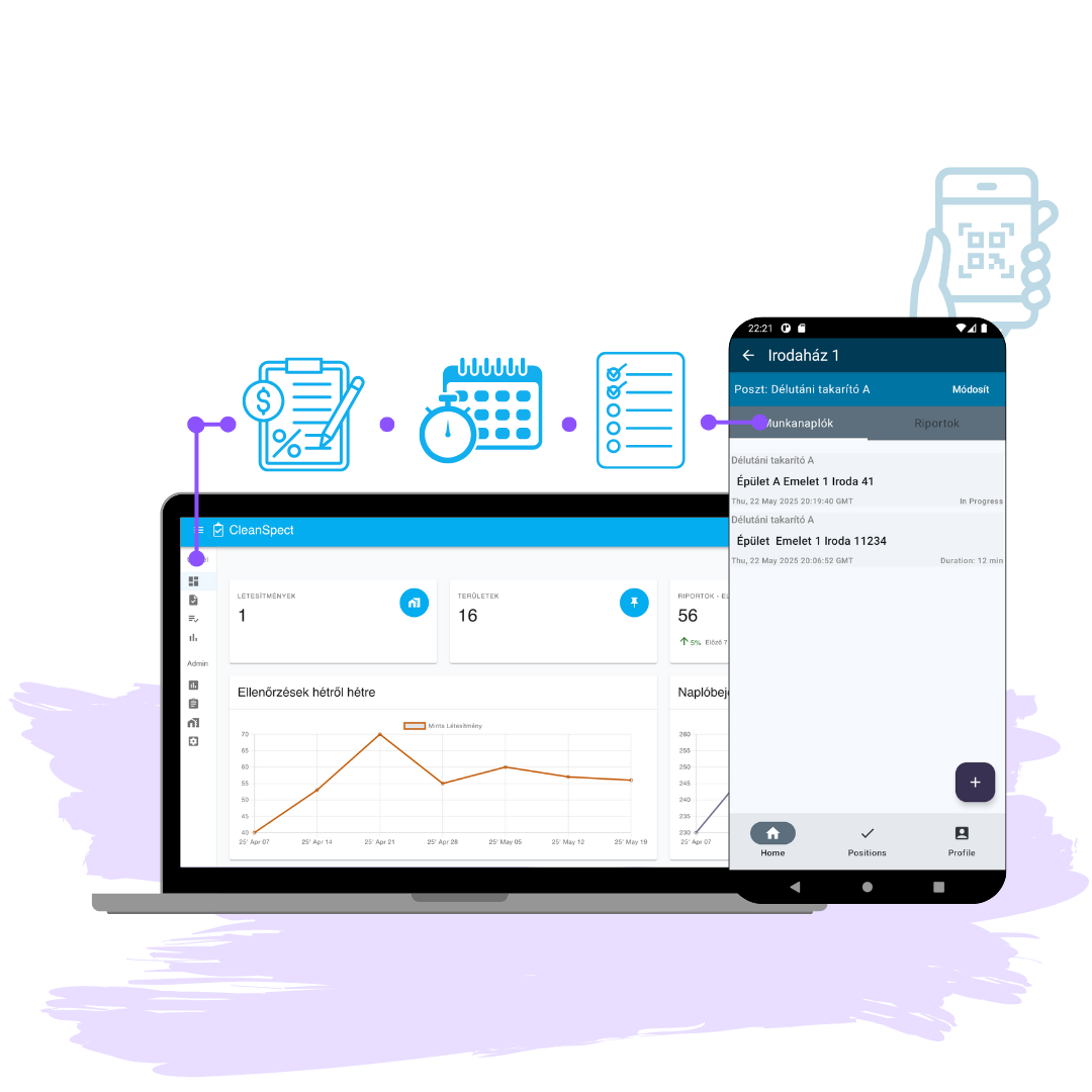 A CleanSpect digitális jelenlét-ellenőrzése időbélyeg QR-kód leolvasás alapján biztosítja, hogy csak a valós munkaidő legyen rögzítve, visszaélés kizárt.